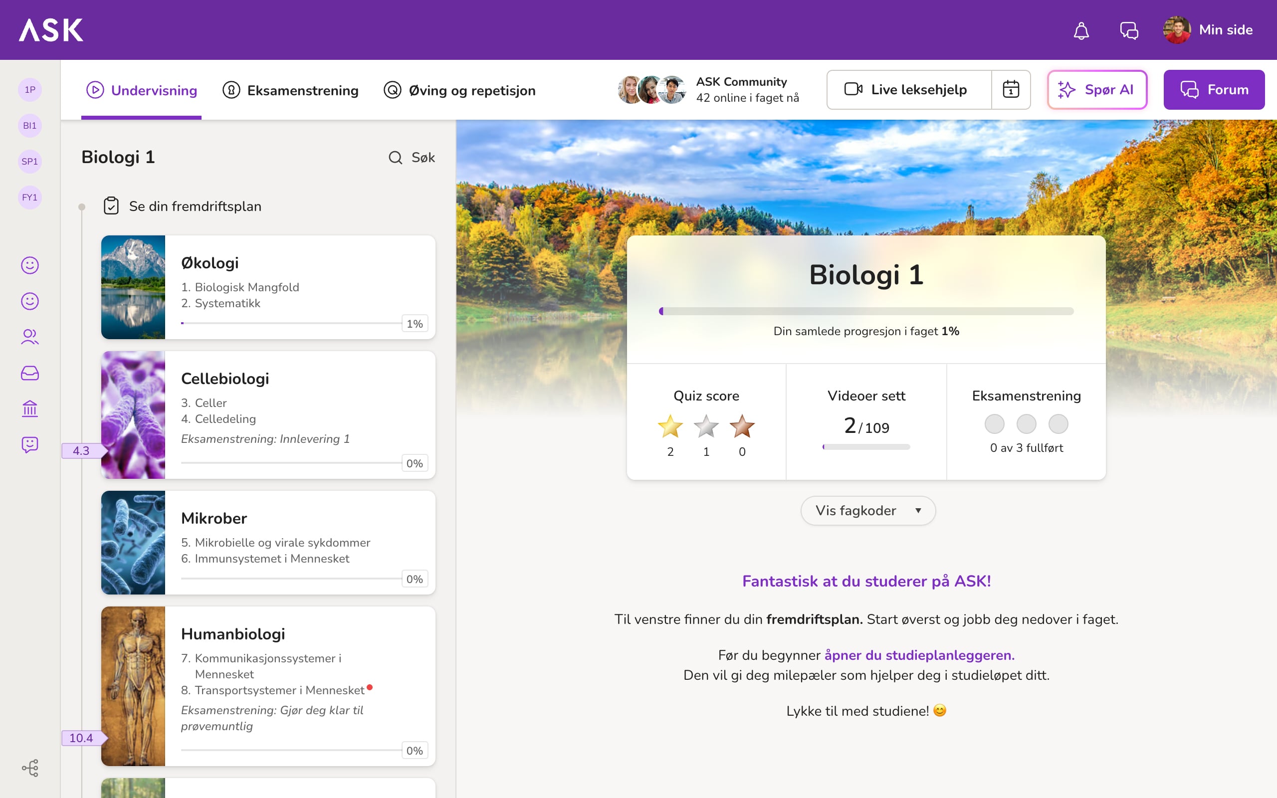I tillegg får du en fremdriftsplan som gir deg oversikt og hjelper deg mot eksamen, samt muligheten til å samarbeide med andre elever i ASK Community.